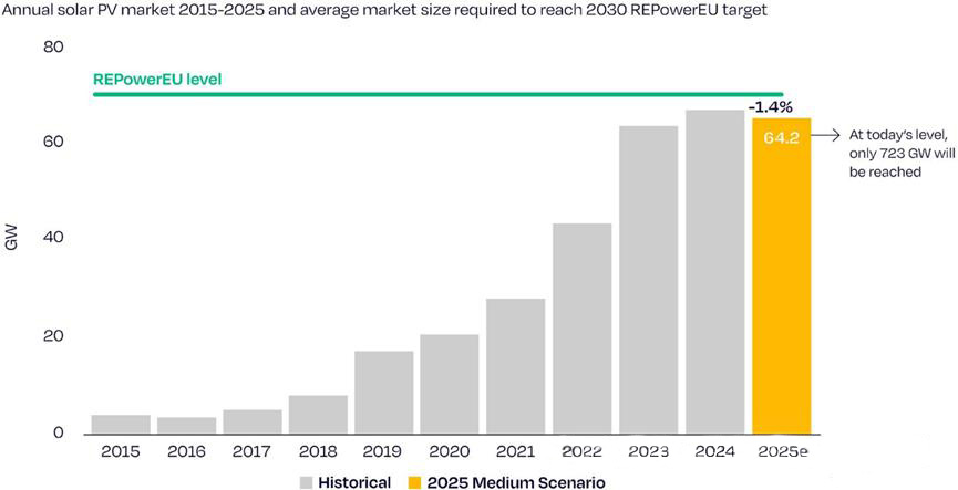 Az EU „REPowerEU” tervének „2030-ra elérendő összesített 600 GW váltakozó áramú oldali (750 GW egyenáramú oldali) fotovoltaikus kapacitás” célkitűzése alapján a következő öt évben évi 69,6 GW-os növekedésre van szükség. A jelenlegi növekedési ütem alapján azonban a kumulatív telepített kapacitás várhatóan mindössze 723 GW-ot (egyenáramú oldal) ér el 2030 végére, ami 27 GW-tal kevesebbet hagy a cél elérésétől.