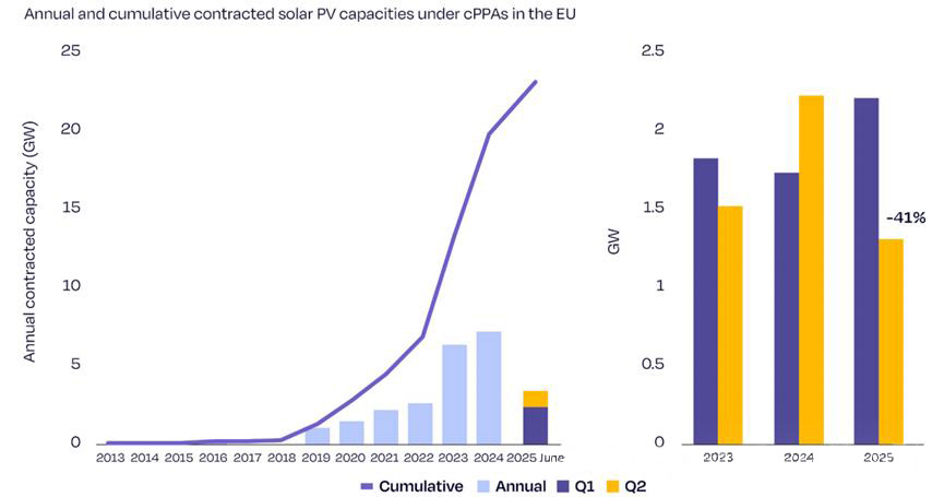 2025 első negyedévében a PPA (villamosenergia-vásárlási megállapodás) szerződéskötések száma elérték a 2,2 GW-ot, amivel növekedési tendenciát mutatott. A piac azonban a második negyedévben a lassulás egyértelmű jeleit mutatta, a szerződéskötések száma 41%-kal, 1,3 GW-ra zuhant, ami közel három év legalacsonyabb értéke. A jelentés úgy véli, hogy a tartósan alacsony, sőt csökkenő nagykereskedelmi villamosenergia-árak gyengítették az áramfogyasztók lelkesedését a hosszú távú megállapodások megkötésére, míg a fix beruházási költségek által korlátozva a fejlesztők nem hajlandók alacsony áron szerződéseket kötni. Várható, hogy az árverseny továbbra is befolyásolja az új szerződések mértékét, amíg egy új egyensúlyi állapot nem alakul ki.