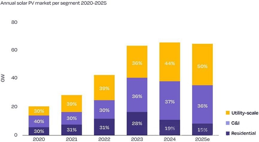 A lakossági energiaprojektek támogatásának fokozatos megszűnése számos országban a növekedés lassulásához vezetett, így a talajra telepített erőművek váltak a fő pillérré.